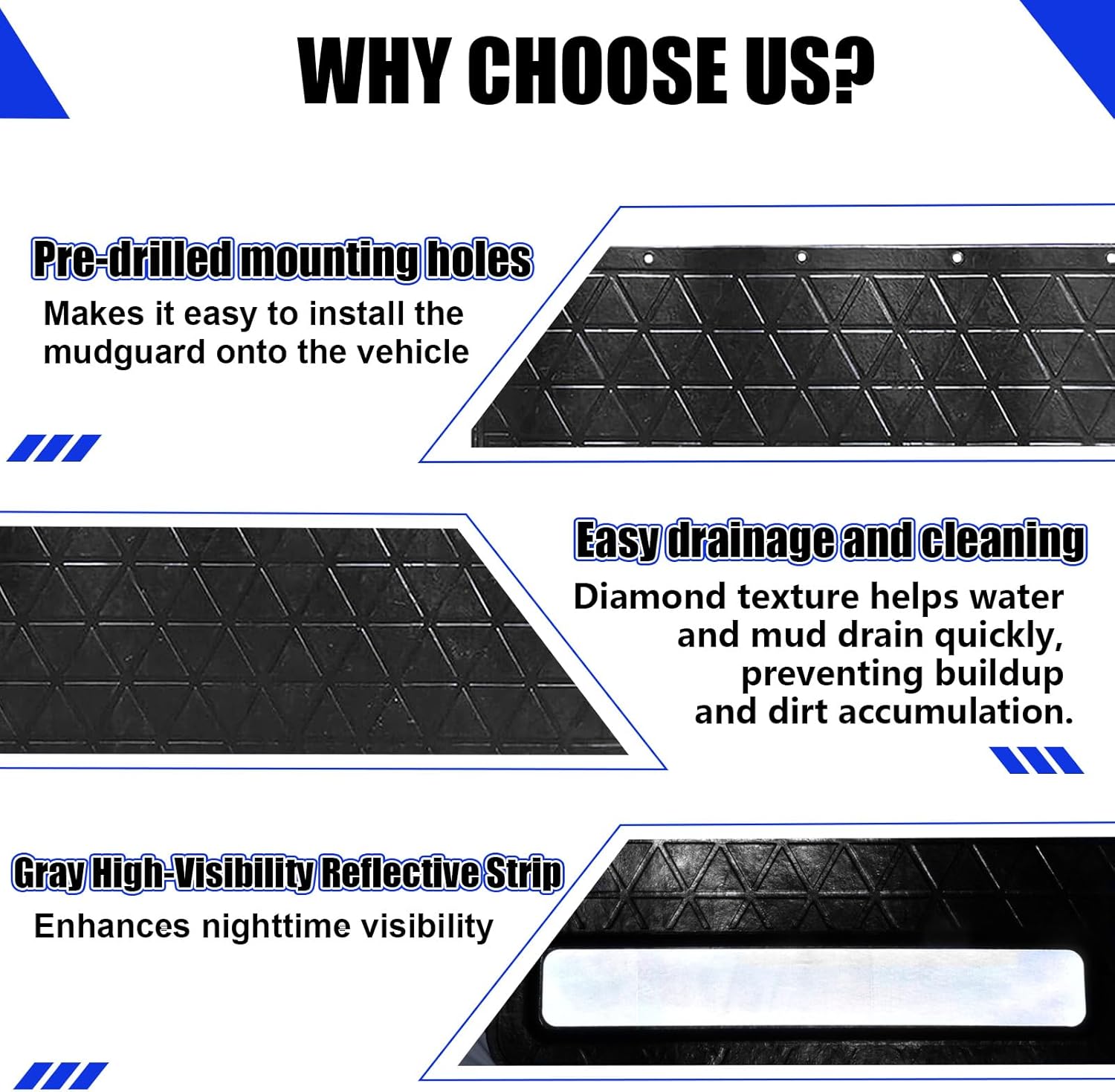 - All-Weather Protection:Effectively blocks mud, snow, slush, and road spray from being thrown up by your tires. This keeps your vehicle, trailer, and following cars cleaner while reducing corrosion and paint damage