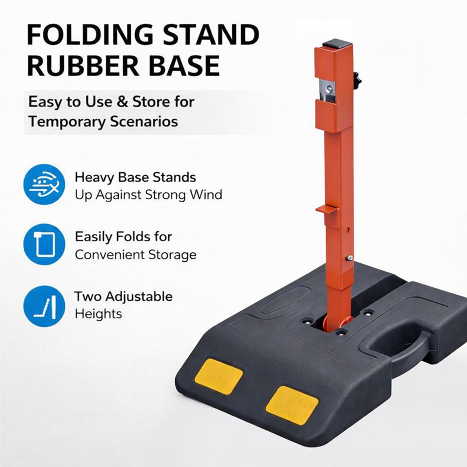 Engineered for stability and portability, our Roll-Up Sign Stand features a solid, weighted rubber base that provides reliable, ready-to-use support for your signage needs. With a quick-folding frame and integrated carry handle, this stand offers a convenient, professional-grade solution for temporary signage at roadwork sites, events, construction zones, and indoor/outdoor facilities. The front and back sides of the base are equipped with yellow reflective panels to enhance visibility from primary directions.
