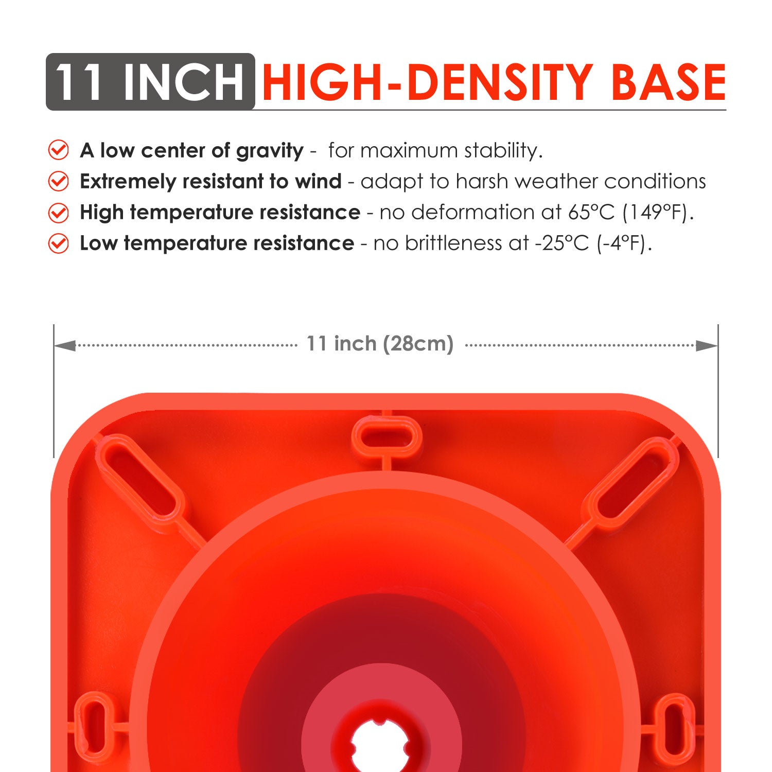 Long-lasting brilliant fluorescent orange color provides high visibility. Ultraviolet stabilized color provides maximum resistance to fading. A high-density base creates a low center of gravity for maximum stability. Engineered to meet MUTCD specifications.
